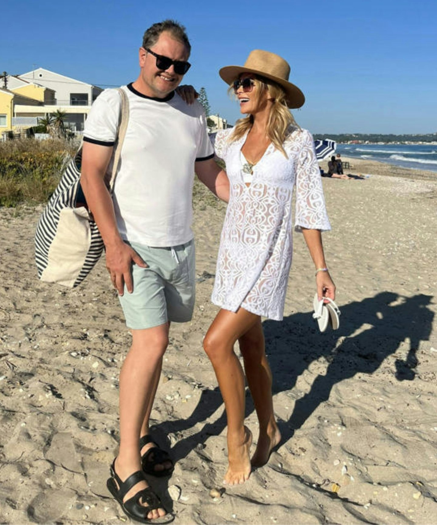 Spotted on Acharavi Beach, Amanda layered a white bikini under the Maya Beach Dress in Bianca Daydream by Leyla Maya, a British luxury swim and beachwear brand we love. Light, floaty and perfect for beach-to-bar. Unfortunately, it’s only available in a size large now.