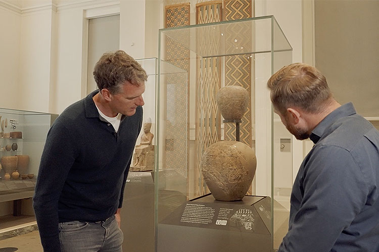 While the Ashmolean’s collection features fascinating grand pieces from this era like the large limestone statue of the Ancient Egyptian fertility god Min (c. 3,300 BC), the greatest insights into the world these early gods and rulers emerged from come from smaller, finely crafted objects. In the documentary, Dan is granted special access to rare collection items dating from 3,600 BC onwards – objects that were already considered ancient by the time of the great pharaohs.