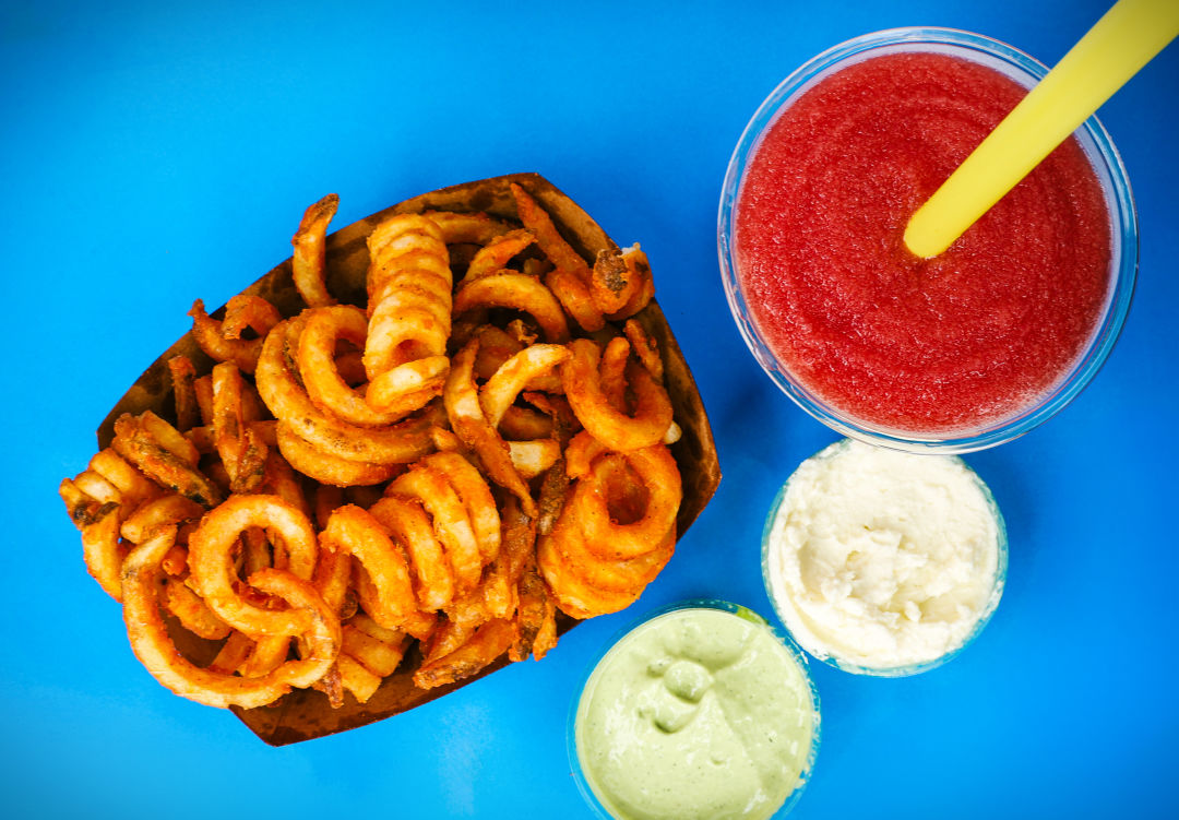 Objectively, a curly fry requires more skill and effort for a restaurant to make well than a straight fry. The bulky shape takes extra space to store, the fragile curls are prone to breakage, and the doubled-over shape can steam the crunch off even the best fry job. None of that matters to a place that traffics in things like pineapple and green peppercorn tepache slushies and fig mascarpone soft serve. Milk Drunk commits to the bit, turning out crispy battered spirals, ideal for dunking in green aioli, whipped garlic, or the bright, herby housemade ranch.