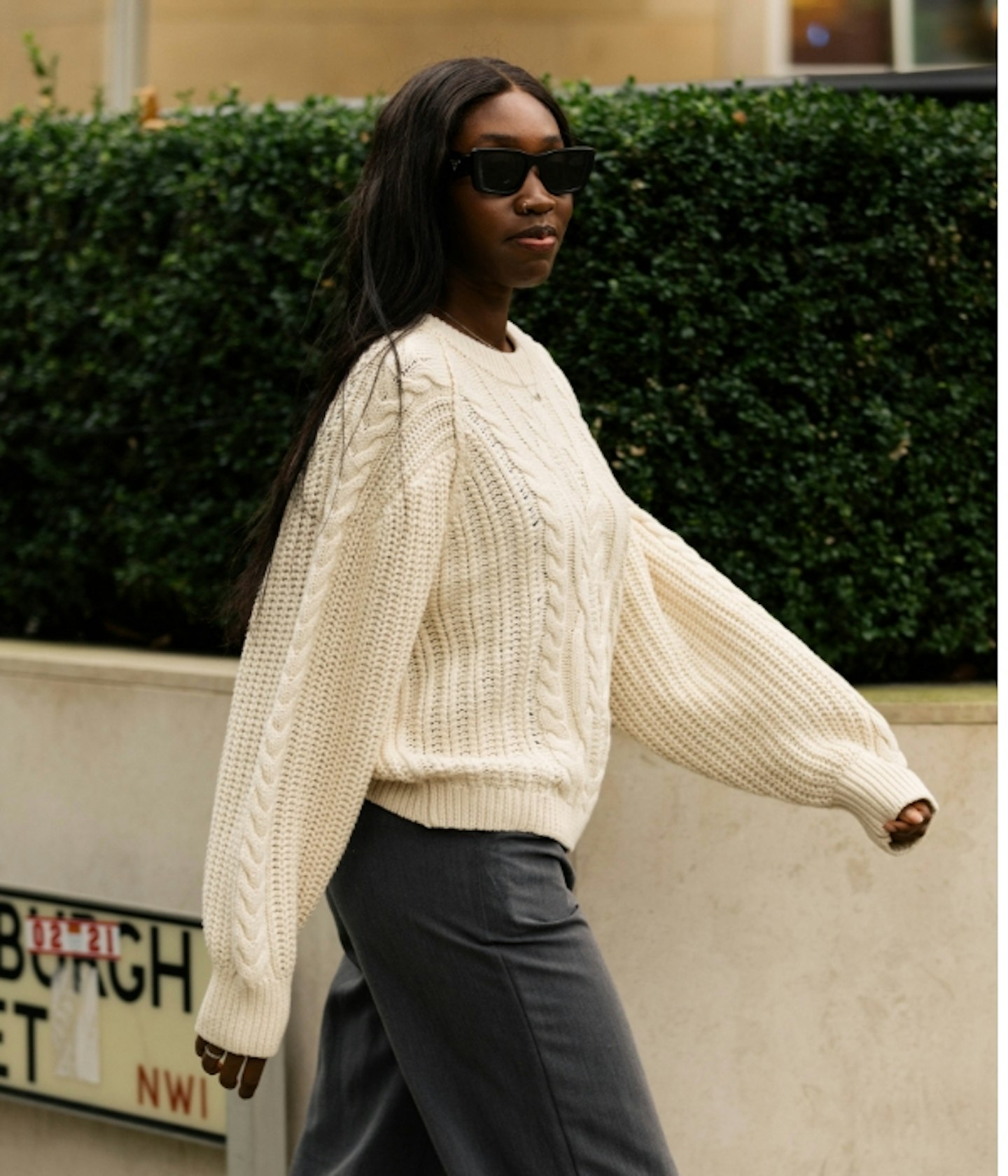 ‘A classic cable knit jumper is a quiet hero in any winter wardrobe,’ Grazia‘s Fashion Writer, Renee Washington, says. ‘Its woven texture is polished enough to wear solo, yet understated enough to layer effortlessly over a crisp white shirt for a preppy finish. Opt for timeless shades like beige, grey, or navy, and invest in high-quality, natural fibres – these will stand the test of time and can be rotated seamlessly year after year.’