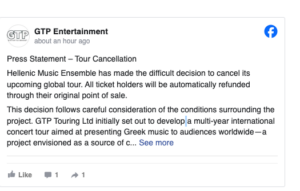 GTP Touring Ltd originally set out to develop a multi-year international concert tour to introduce Greek music to audiences around the world – a project envisioned as a source of cultural pride. Unfortunately, circumstances beyond our control made it impossible to continue the project. We regret to say that we have no viable option but to withdraw.